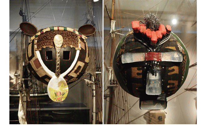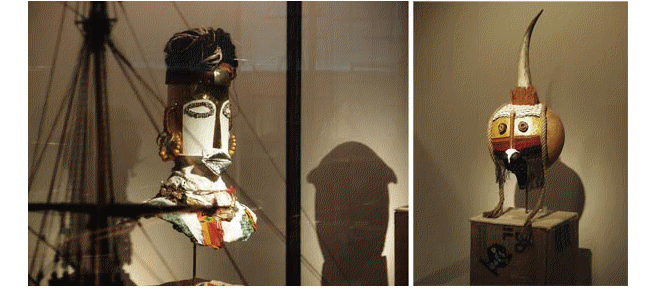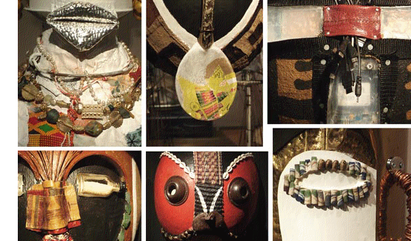 |  Space installationAHOOBAA - Dedicated to the Ancestresses and Ancestors Exhibition opening We 21st June 2017 7 p.m. Exhibition 22nd June - end of 2017Talk with the Joe Sam-Essandoh and the curator Hannimari JokinenSu 17th September 2017 3 p.m. Altonaer MuseumMuseumstraße 23Hamburg-Altona (S tube Altona) Opening hoursTu - Su 10 a.m. - 5 p.m. Entrance feesEUR 8,50, reduced price EUR 5, groups EUR 6  www.altonaermuseum.de (in German) In his space installation AHOOBAA, the Ghanaian artist Joe Sam-Essandoh brings to life mask objects made of diverse discarded materials. His assemblages consist of used and worn-out found objects, traces of luxury delicacies from European breakfast tables, materials from the packaging industry and civilisational trash.  Borrowed from nature are calabash, wild boar tusks, cow and goat horn; from the West African coast, cowrie and coconut shells; as products of Ghanaian artisans, jute rope, wooden combs, Kuba Raffia cloth and wickerwork; referring to the robbed natural resources of Africa, golden surfaces, copper and tin; and remembering the forced and contract labor in the plantations, palm oil seeds, coffee and cocoa beans.  Sam-Essandoh's assemblages point to products and raw materials that are exported from Africa to western countries. They admonish us reminding of the "colonial wares" and of the raw materials that this continent is so rich of and that are, to this day, being plundered by the industrial countries. With eyes open wide, the masks stare back at the viewer, entering into a dialog and questioning what the future holds. The mask objects will be presented in the Altonaer Museum as an intervention in the permanent collection. Models of ships that sailed from the Altona harbor to the world oceans during the 18th and 19th centuries are displayed in the museum's section on merchant shipping. With Sam-Essandoh's space installation, the museum recalls an important facet of Altona's town and trading history: the participation of Altona shipowners and merchants in the transatlantic trade. The museum sees the intervention as a first step in the pending new conception of its permanent collection where Altona's role in the Danish colonial history has not yet been thematised. Guest book exhibition AHOOBAA by Joe Sam-Essandoh (in German) Interview with Joe Sam-Essandoh (in German)taz, Petra Schellen. 09/11/2017Das Erbe des Kolonialismus"Die Kakao-Maske ist ein Protest"